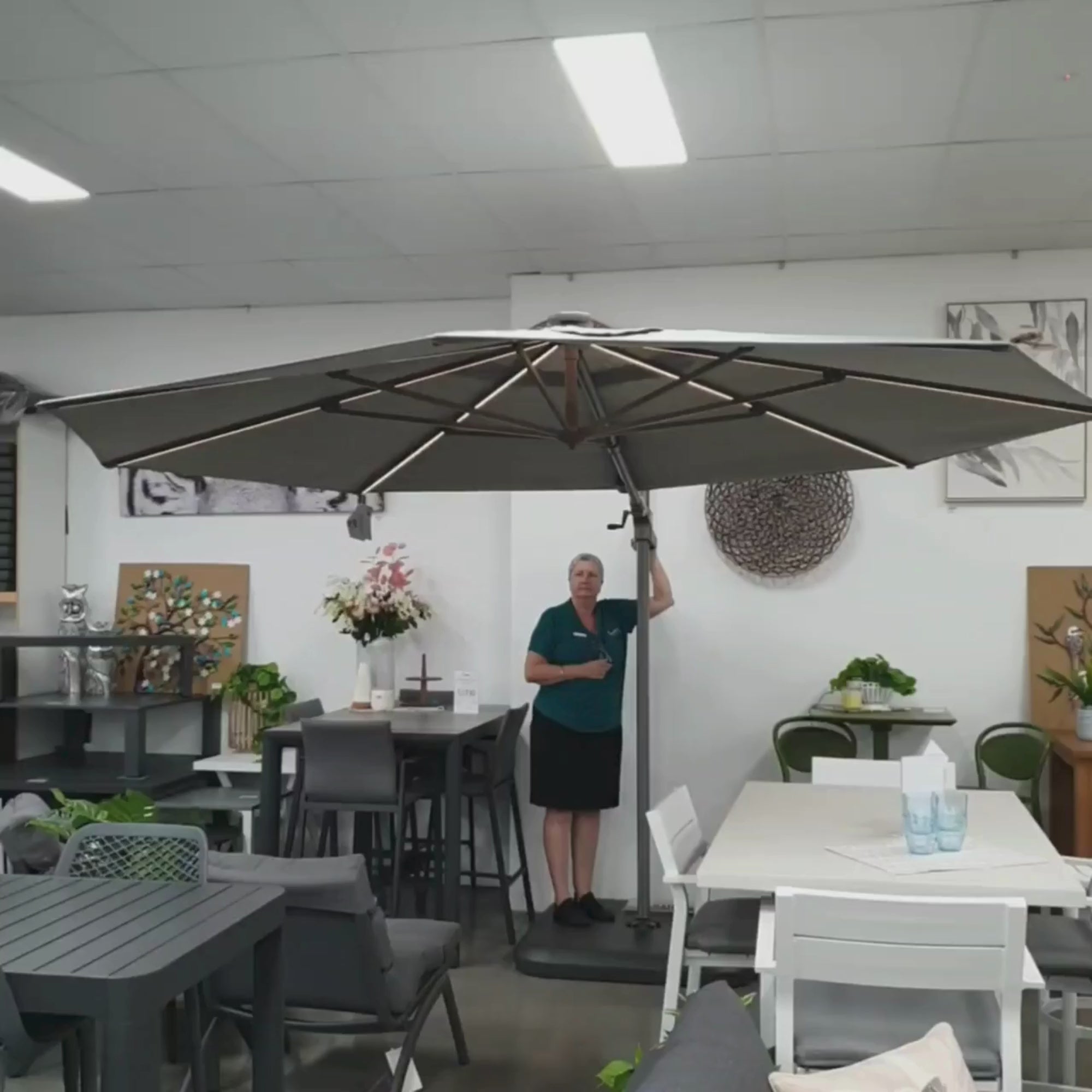 A cantilever umbrella is used to provide a completely use-able area underneath the canopy. Cantilever umbrellas can be rotated 360° and tilted to allow you to follow the sun and shade as required.