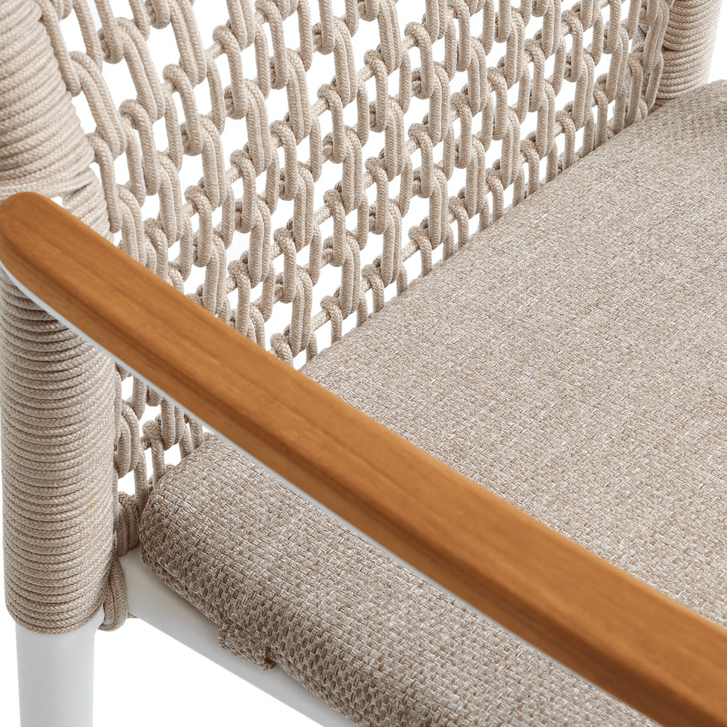 - 6 x Addis Rope Outdoor Dining Chairs - White frame with beige rope backrest, teak armrests, and beige cushions