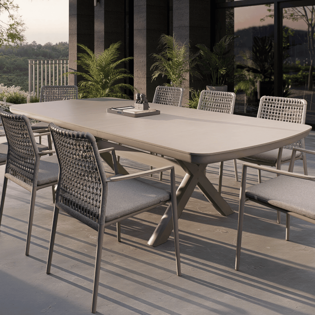 At the heart of this setting sits the Ashton table, extending seamlessly from 2m to 2.6m to accommodate six to ten guests. The striking charcoal aluminium frame features a distinctive cross-braced base that delivers both architectural presence and unwavering stability, whilst the Bottega sintered stone top performs flawlessly through Brisbane's subtropical seasons - impervious to intense summer UV, resistant to sudden storm splashes, and unfazed by hot serving dishes straight from the barbecue.