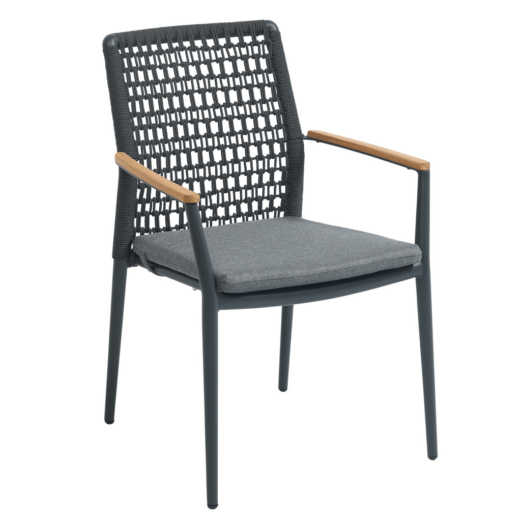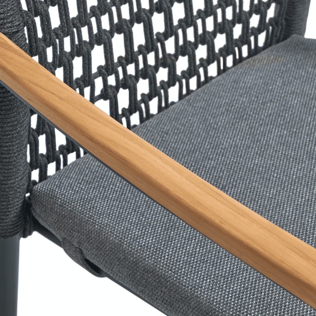 - 8 x Addis Rope Outdoor Dining Chairs - Charcoal frame with rope backrest, teak armrests, and charcoal cushions