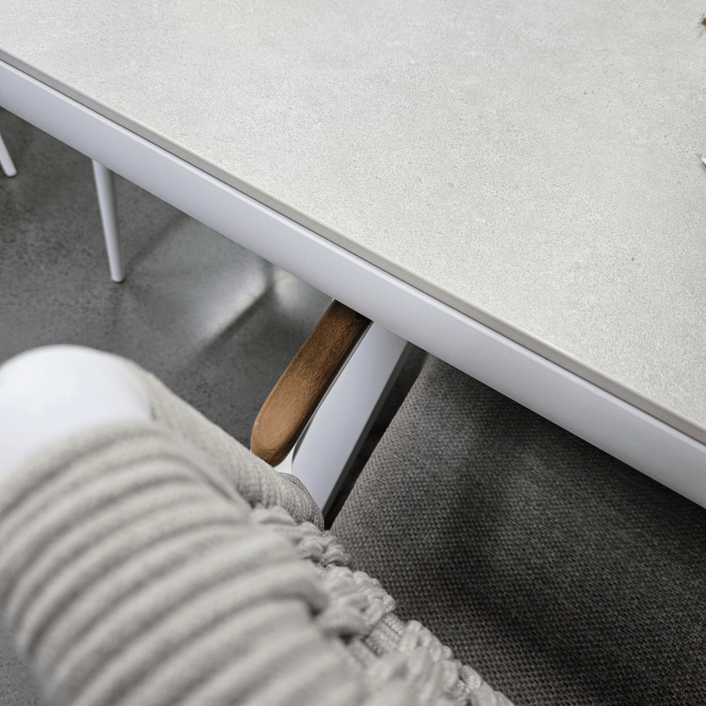At the heart of this setting sits the Ashton table, extending seamlessly from 2m to 2.6m to accommodate six to ten guests. The striking white aluminium frame features a distinctive cross-braced base that delivers both architectural presence and unwavering stability, whilst the Cream sintered stone top performs flawlessly through Brisbane's subtropical seasons - impervious to intense summer UV, resistant to sudden storm splashes, and unfazed by hot serving dishes straight from the barbecue.