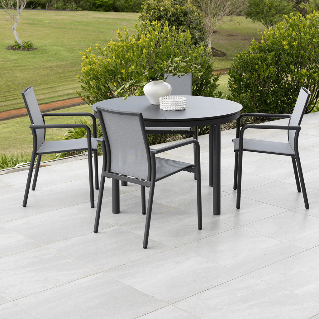 Crafted with a durable aluminium frame and aluminium tabletop with subtle groove detailing, the seamless extension mechanism operates with the same fluid motion you'd expect from premium outdoor furniture, whilst the sleek contemporary design and minimalist silhouette suit both covered alfresco areas and open-air settings. Built to withstand Brisbane's subtropical climate without compromising its refined aesthetic, Globe brings clever functionality and elegant simplicity to your outdoor entertaining. Available in charcoal as well as white, mix and match with your choice of dining chairs to create a personalised outdoor dining set.